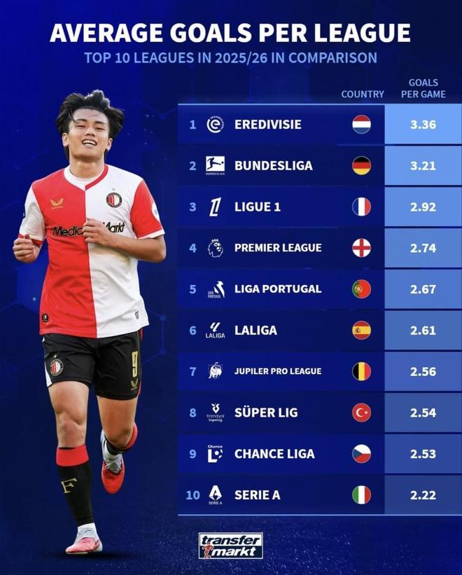 最近德國轉會市場發布了2025/26賽季前10大聯賽場均進球榜。荷甲、德甲、英超、西甲、意甲全部在列,場均進球差距拉得不小。荷甲單場3.36球火力全開,意甲只有2.22球被不少球迷吐槽“太保守”,到底哪個聯賽更好看?再把各聯賽的成立時間和球隊數量放在一起看,這份榜單背后的味道就更有意思了。